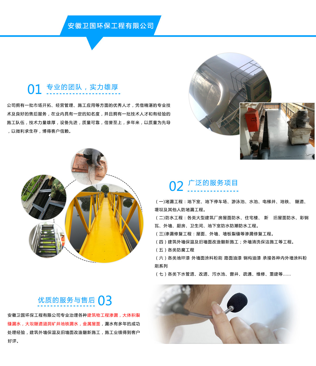 安徽衛(wèi)國(guó)環(huán)保工程有限公司專業(yè)治理各種建筑物工程滲漏,大體積裂縫漏水,大壩隧道涵洞礦井地鐵漏水,金屬屋面,漏水有多年的成功處理經(jīng)驗(yàn),建筑外墻保溫及舊墻面改造翻新施工,施工業(yè)績(jī)得到客戶好評(píng)。